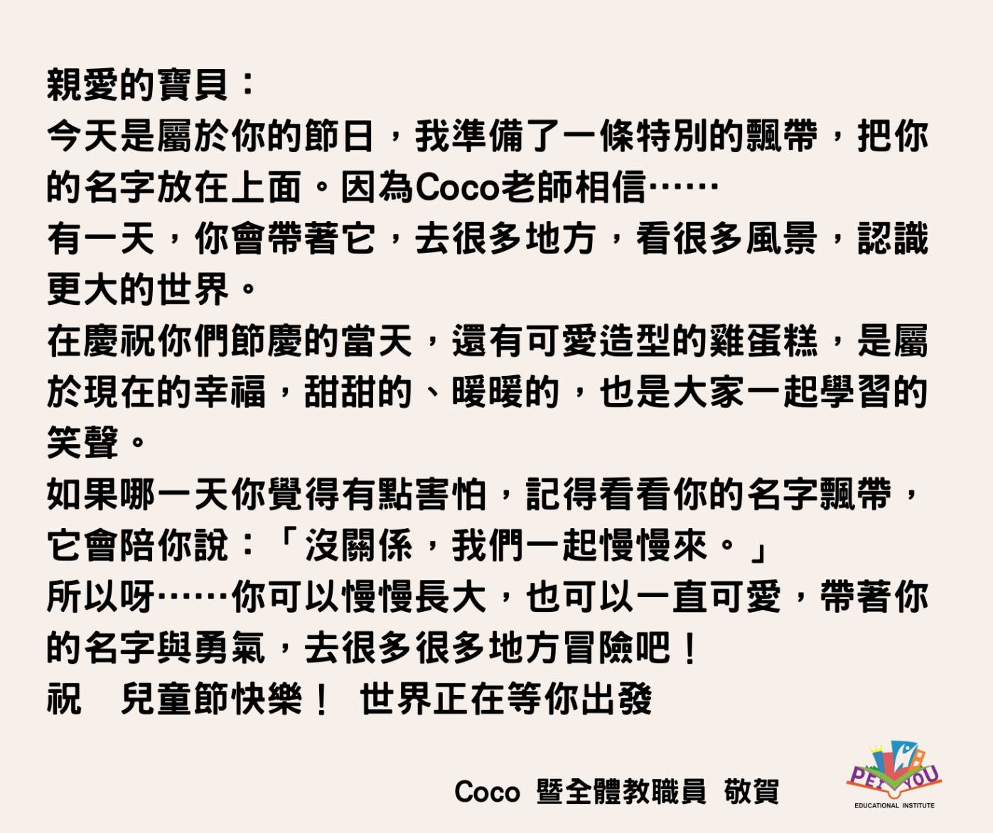 在這特別的節日裡,我們想告訴孩子們:你們的笑容,是世界上最美的風景;你們的純真,是最珍貴的寶藏。願你們在愛與關懷中自由成長,勇敢探索,快樂做自己